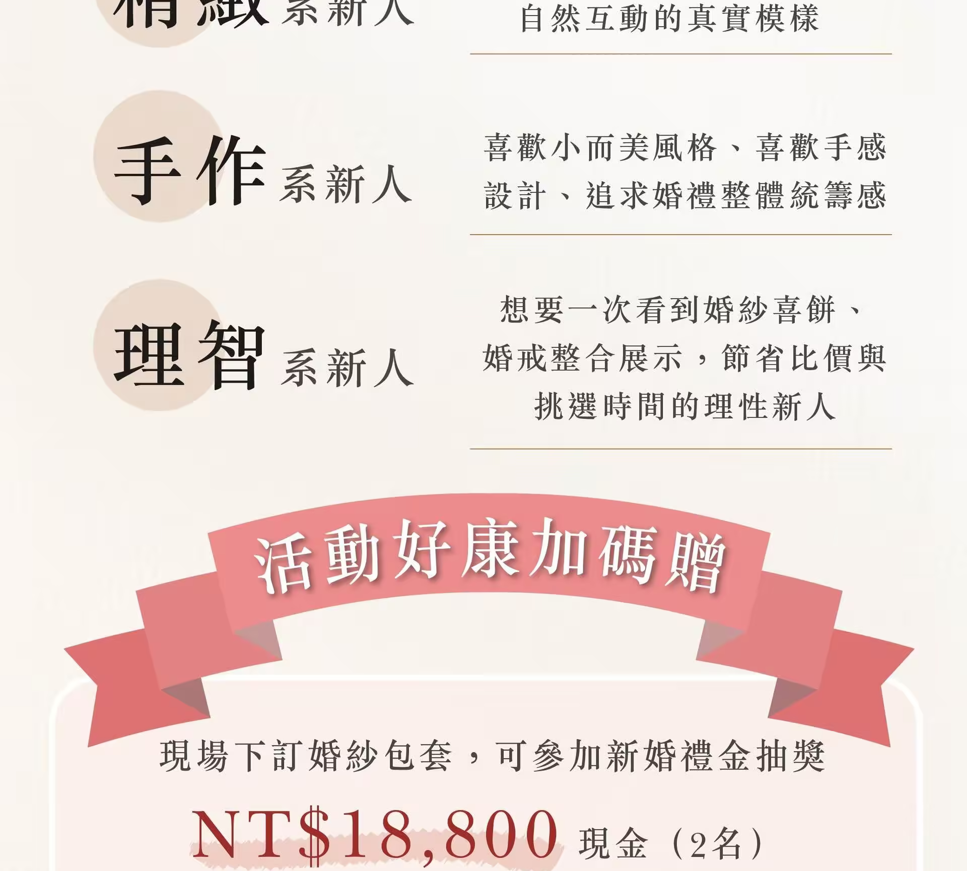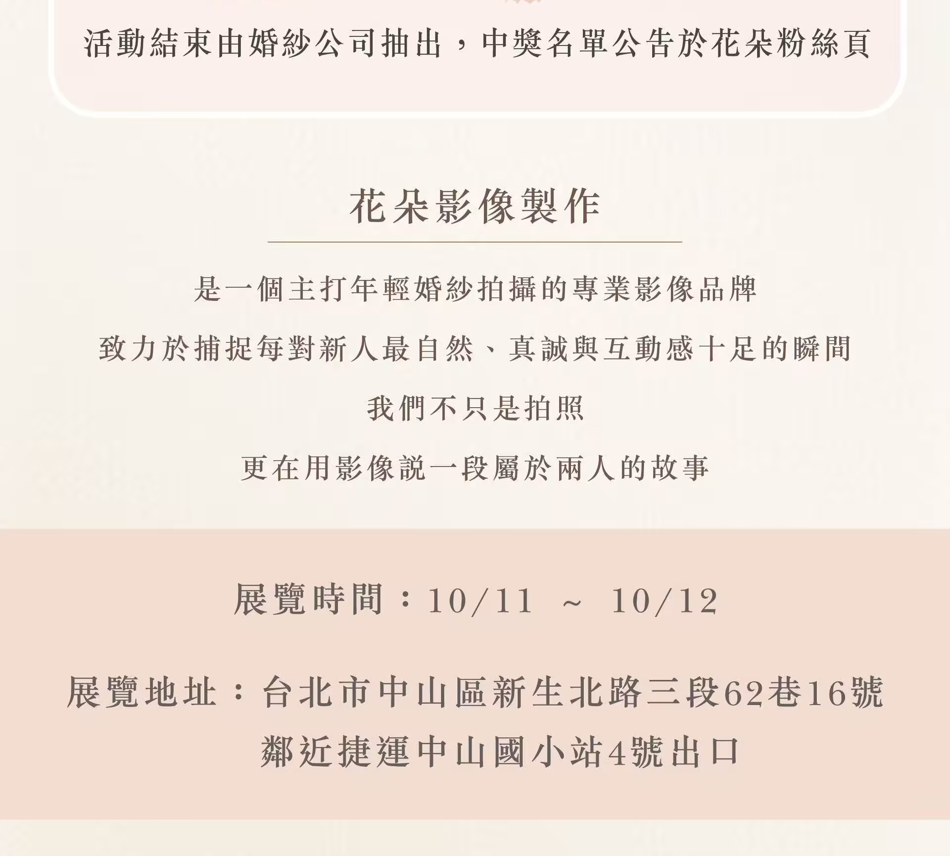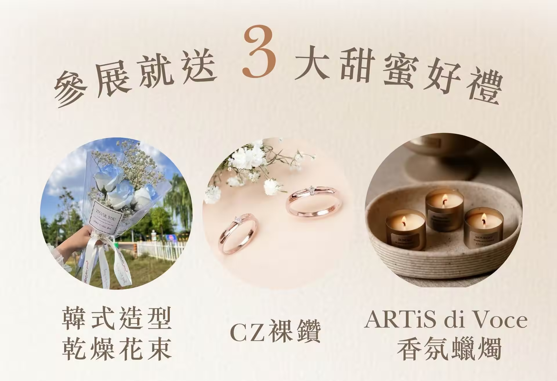 溫馨提醒📣:展覽位置於台北市中山區新生北路三段62巷16號1F(近捷運中山國小站4號出口),婚紗展報到禮直接送CZ裸鑽💍免抽獎、ARTiS di Voce 香氛蠟燭、韓式造型乾燥花束,現場下訂婚紗包套即可參加新婚禮金抽獎,詳情請私訊粉專
